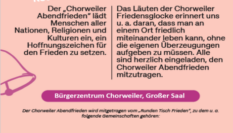 Der Chorweiler Abendfrieden lädt regelmäßig am 1. Freitag eines Monats um 16:30 Uhr zum Abendfrieden auf den Pariser Platz im Chorweiler Zentrum ein! Pariser Platz 50765 Köln Am 1. Februar 2026 zwischen 17 und 19 Uhr wird der Abe ...