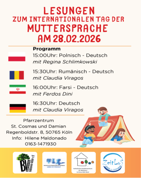 Lesungen für Kinder in Muttersprache am 28.02.2026 in St. Cosmas und Damian Volkhoven/Weiler von 15 - 17 Uhr ORT: Regenboldstr. 8, 50765 Köln