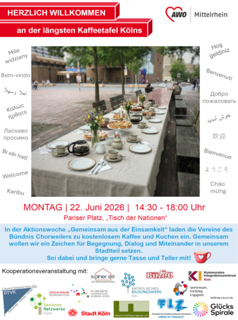 Gespendet von der AWO, Bezirksverband Mittelrhein e.V. findet eine lange Kaffeetafel statt, an die sich Jeder und Jede dazu setzen kann!